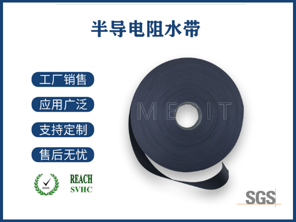 三、電氣特性:半導電阻水帶具有吸濕性強、膨脹率大、膨脹速率快的特點,產品電阻小,具有半導電特性,能有效緩沖、弱化電場強度,機械強度高,易于各種電纜繞包和縱包加工,產品耐熱性好,瞬間耐溫高,電纜可在瞬間高溫時保持性能穩定。